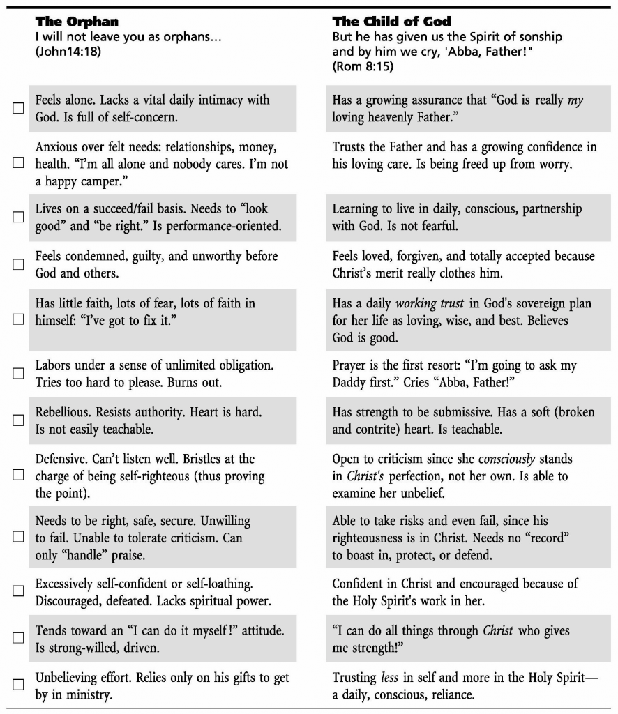 How about you? Do you thrive in the security of the Father’s love for you, or are you living life as a functional orphan? The chart below is from Serge’s Sonship manual. Let’s take a little inventory, shall we?